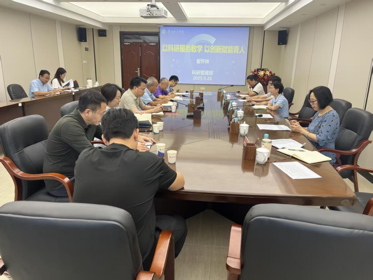 崔怀林部长就科研管理部近年来的工作进行了全面汇报。首先在科研处工作方面,他围绕基本职责、服务教学的理念与思路、科研赋能教学的工作策略与举措、学科与学位点建设推进情况、近三年科研工作成效以及未来工作方向等方面展开介绍,重点展示了近三年学校科研工作的主要成果。随后,他汇报了创新创业学院的相关工作,着重介绍了学科竞赛组织、创新创业训练实施以及帽峰创谷团队孵化等方面的进展。