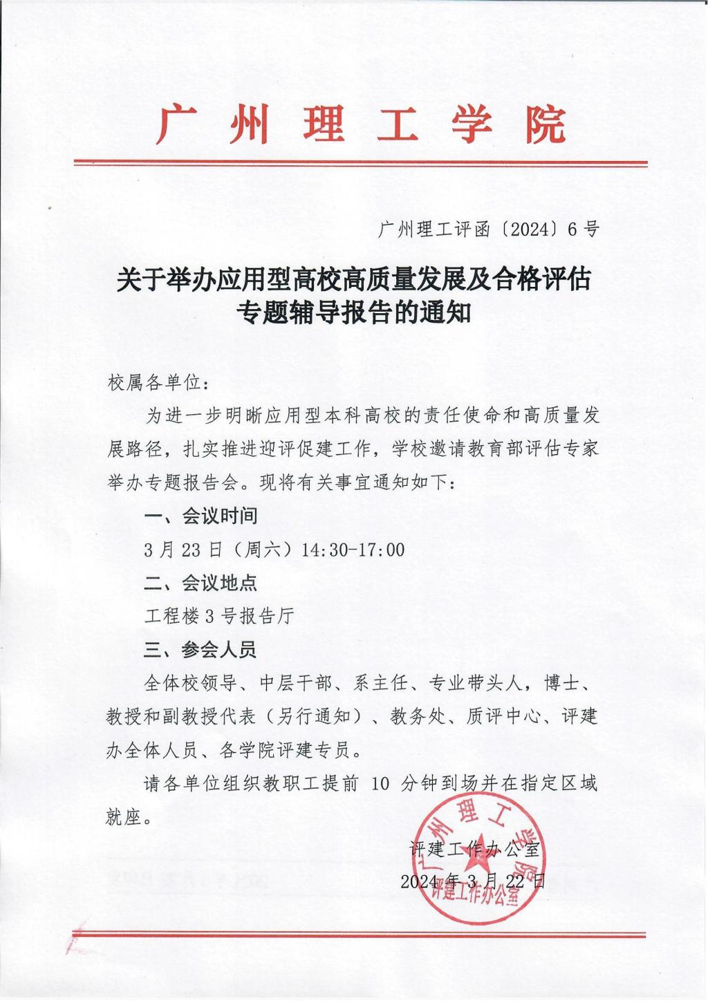 广州理工评函〔2024〕6号 关于举办应用型高校高质量发展及合格评估专题辅导报告的通知