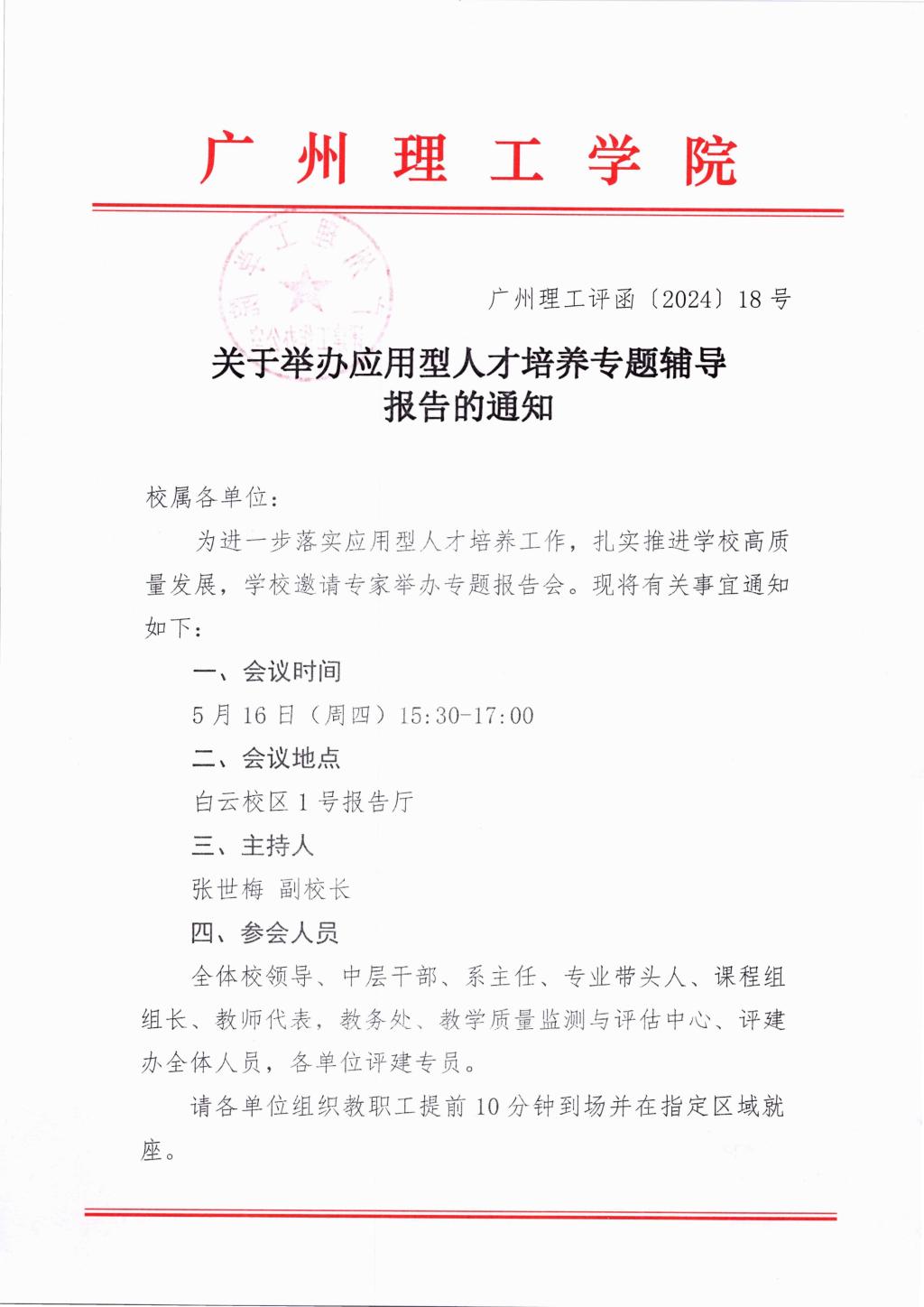 广州理工评函〔2024〕18号 关于举办应用型人才培养专题辅导报告的通知