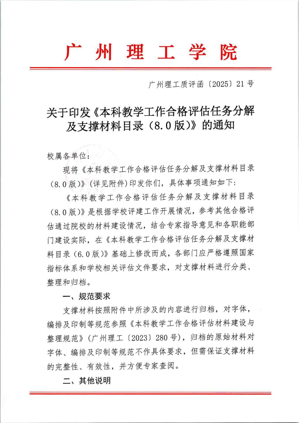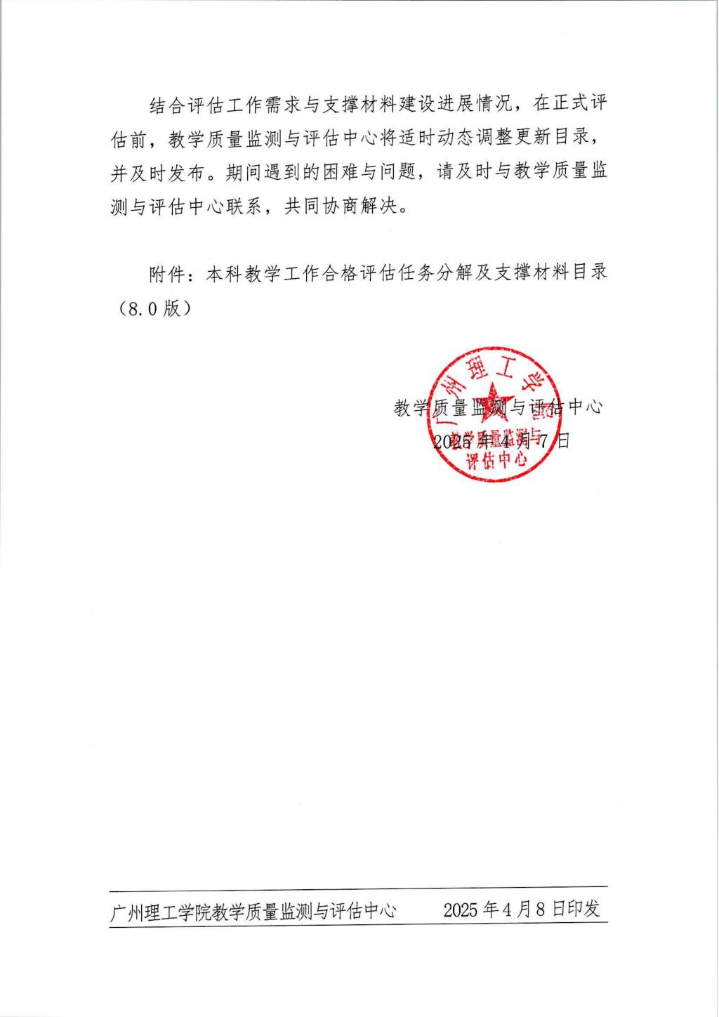 广州理工评函〔2025〕21号 关于印发《本科教学工作合格评估任务分解及支撑材料目录(8.0版)》的通知